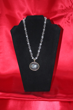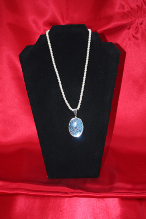 Peacock hologram in glass set on strand of pearls